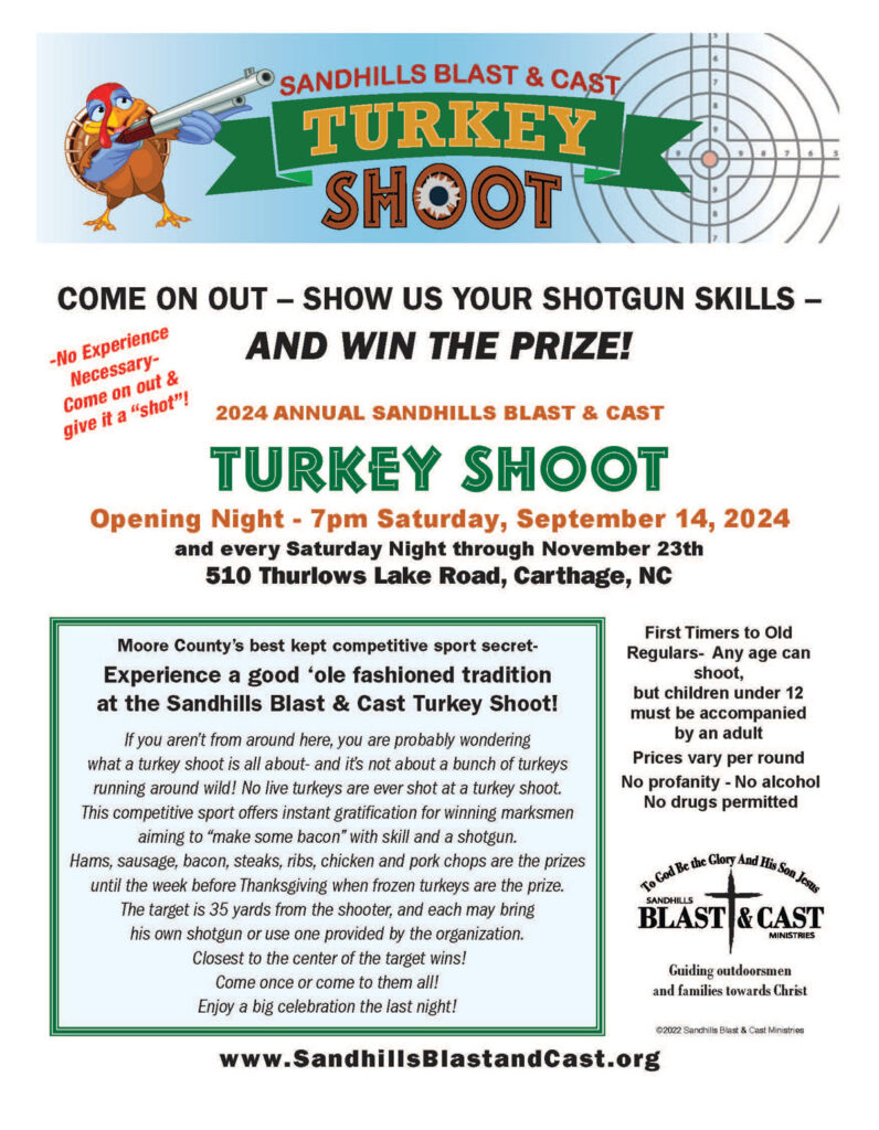 The annual Sandhills Blast & Cast Turkey shoot takes advantage of the nice Carolina fall evenings at Thurlows lake in Carthage, starting at 7pm the Saturday in September of the Blast & Cast event and every Saturday evening through Mid November. (Actual dates are listed on the home page.) The night’s competition ends when everyone has had their chance- so be ready to hang out and go for the prize!